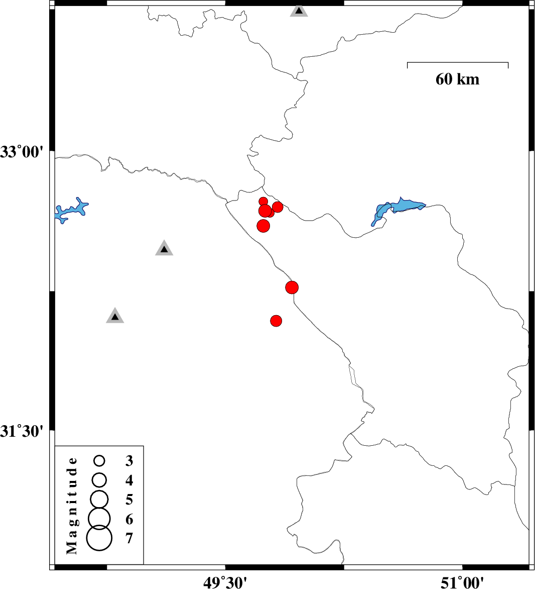 | 2007/06/03 | 06:45:53.4 | 10:15:53.4 | 32.6 | 49.74 | 14 | ML3.6 | 38 km North-West of Chelgard, Chaharmahal Bakhtiari Province | ||