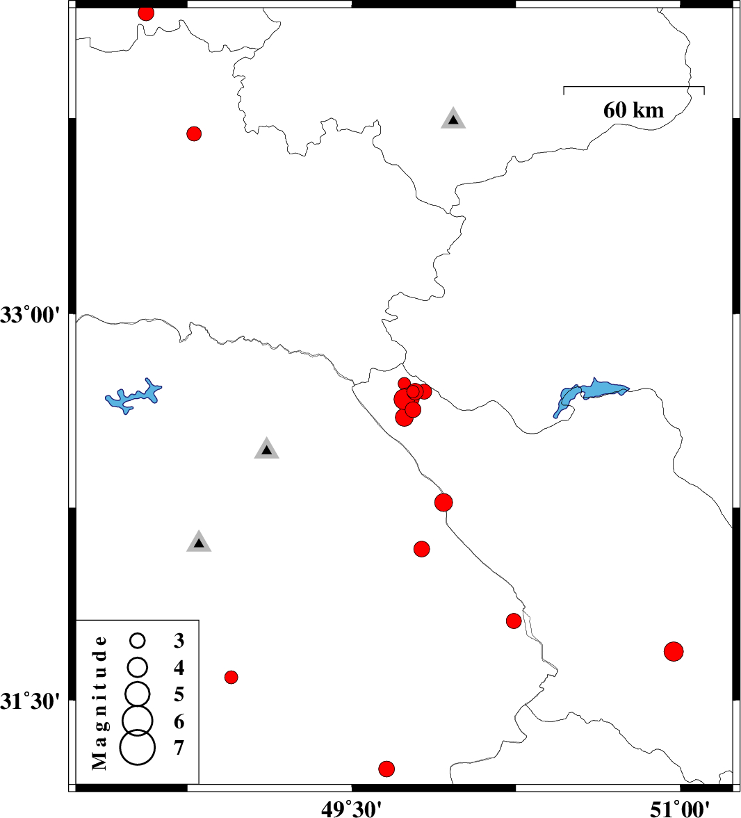 | 2007/06/09 | 06:27:09.3 | 09:57:09.3 | 32.7 | 49.78 | 14 | ML2.6 | 40 km South-West of Fereydunshahr, Esfahan Province | ||