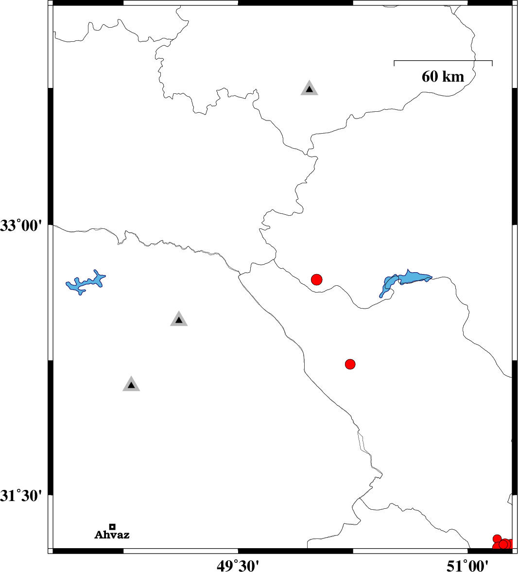 | 2007/05/14 | 08:54:20.7 | 12:24:20.7 | 31.59 | 48.95 | 14 | ML2.7 | 39 km North-East of Ahvaz, Khoozestan Province |