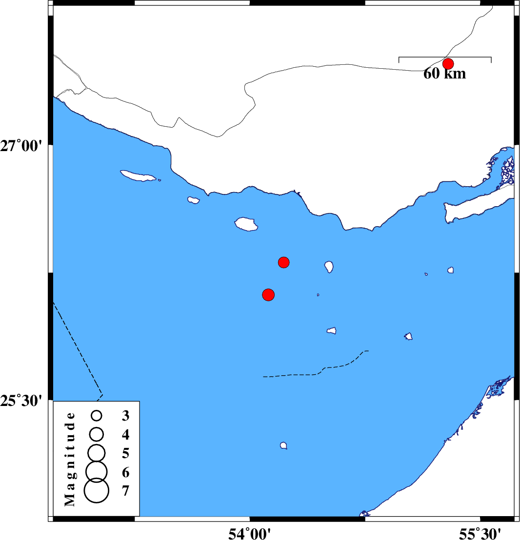 | 2007/06/11 | 02:18:05.5 | 05:48:05.5 | 26.31 | 54.22 | 14 | ML3.2 | Persian Gulf, 67 km South-West of Bandar-e lengeh | ||