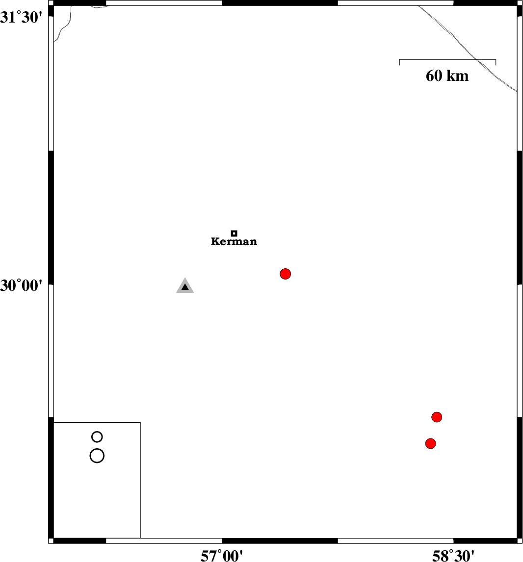 | 2007/06/11 | 05:31:34.1 | 09:01:34.1 | 30.06 | 57.41 | 1 | ML3.1 | 41 km South-East of Kerman, Kerman Province | ||