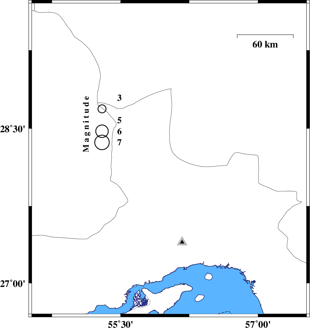 | 2007/04/26 | 04:03:31.2 | 07:33:31.2 | 28.23 | 56.25 | 14 | ML4 | 35 km East of Hajiabad, Hormozgan Province | ||