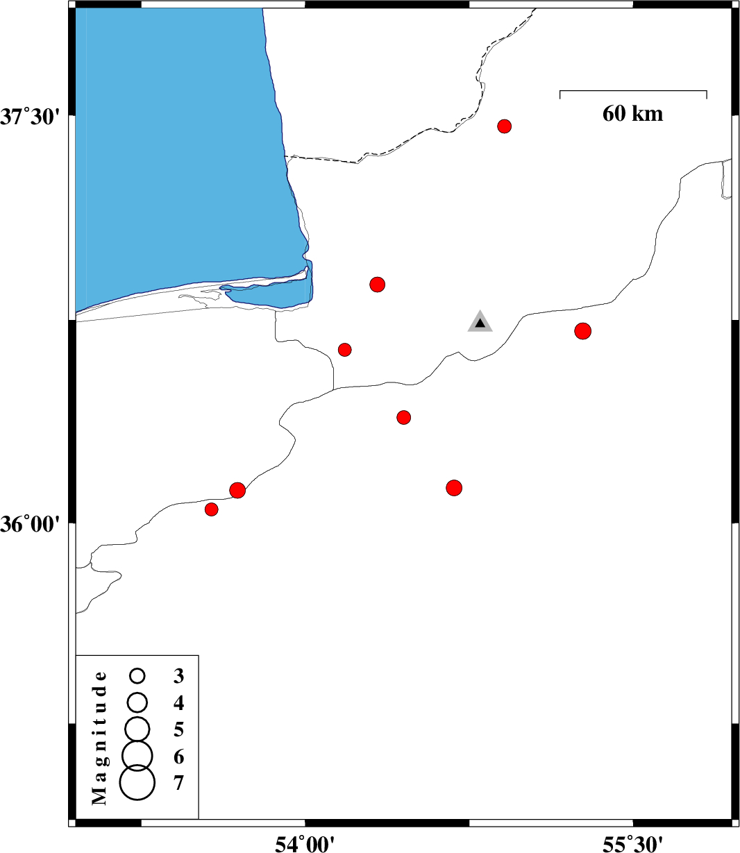 | 2007/05/18 | 09:29:59.8 | 12:59:59.8 | 36.88 | 54.33 | 14 | ML3.1 | 10 km West of Gorgan, Golestan Province |