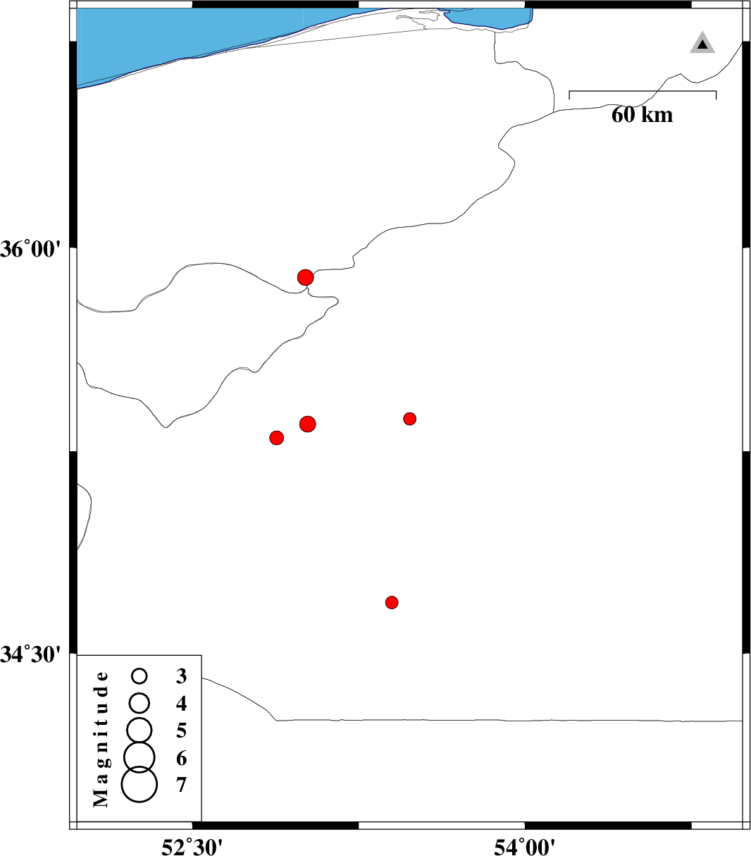 | 2007/04/19 | 23:01:02.9 | 02:31:02.9 | 35.37 | 53.48 | 14 | ML2.6 | 23 km South of Semnan, Semnan Province | ||