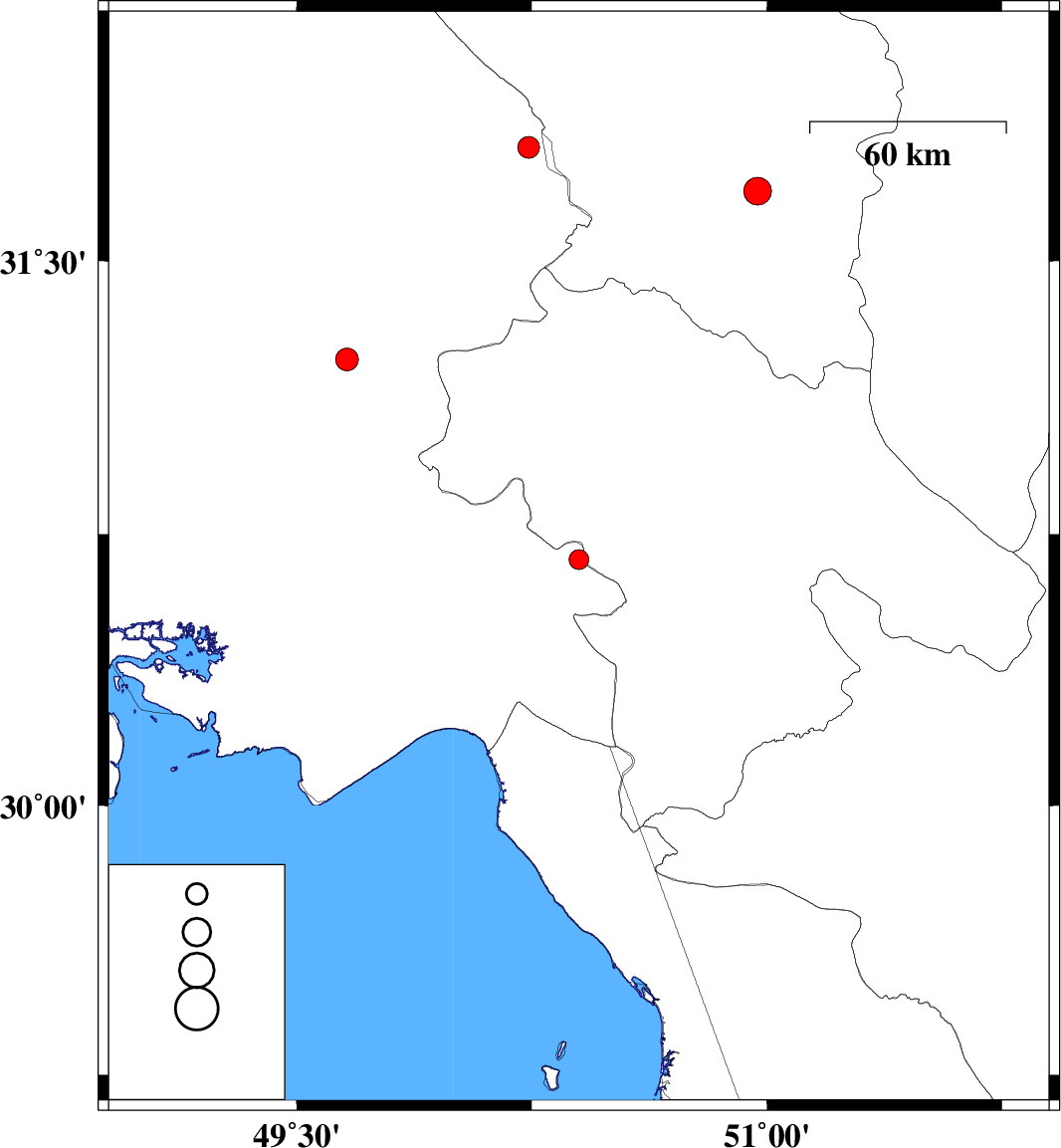 | 2007/05/24 | 20:16:29.3 | 23:46:29.3 | 30.68 | 50.4 | 15 | ML2.8 | 17 km East of Behbahan, Khoozestan Province | ||