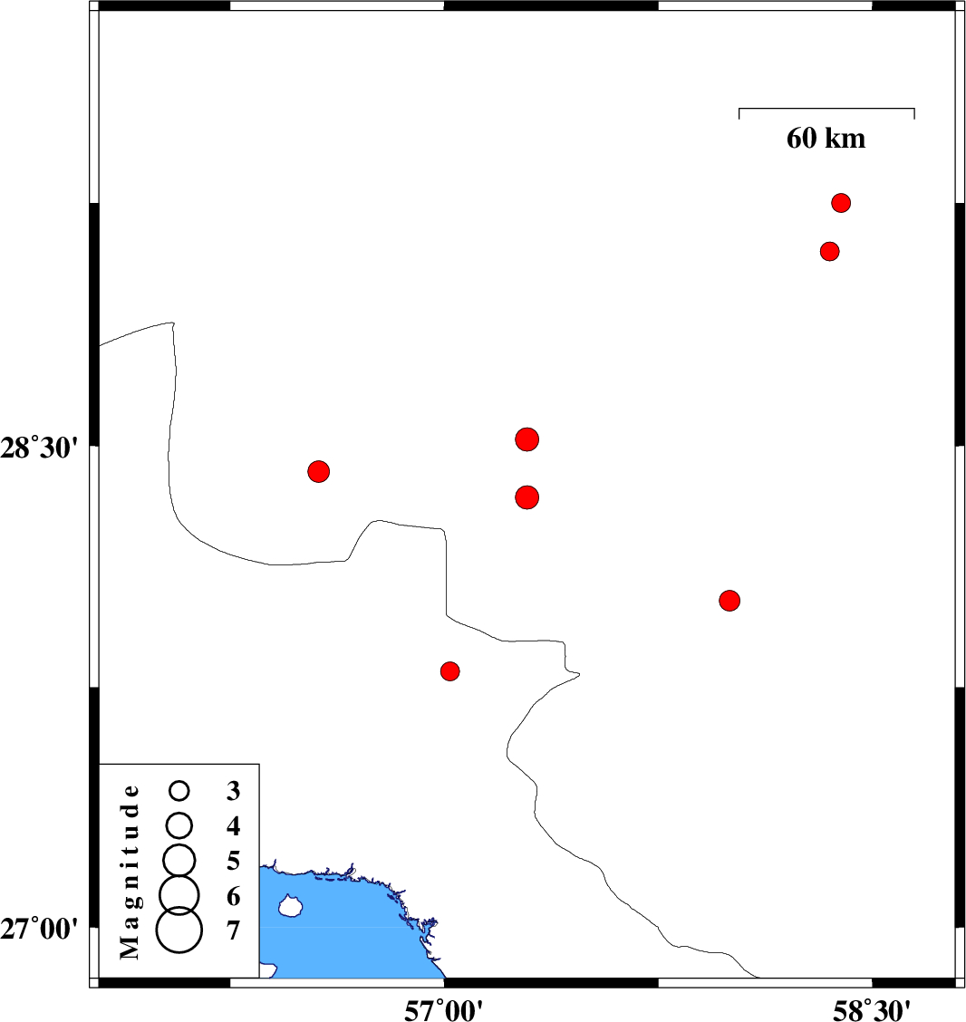 | 2007/06/22 | 22:07:33.4 | 01:37:33.4 | 27.8 | 57.02 | 14 | ML3 | 47 km North-West of Dehbarez, Hormozgan Province | ||