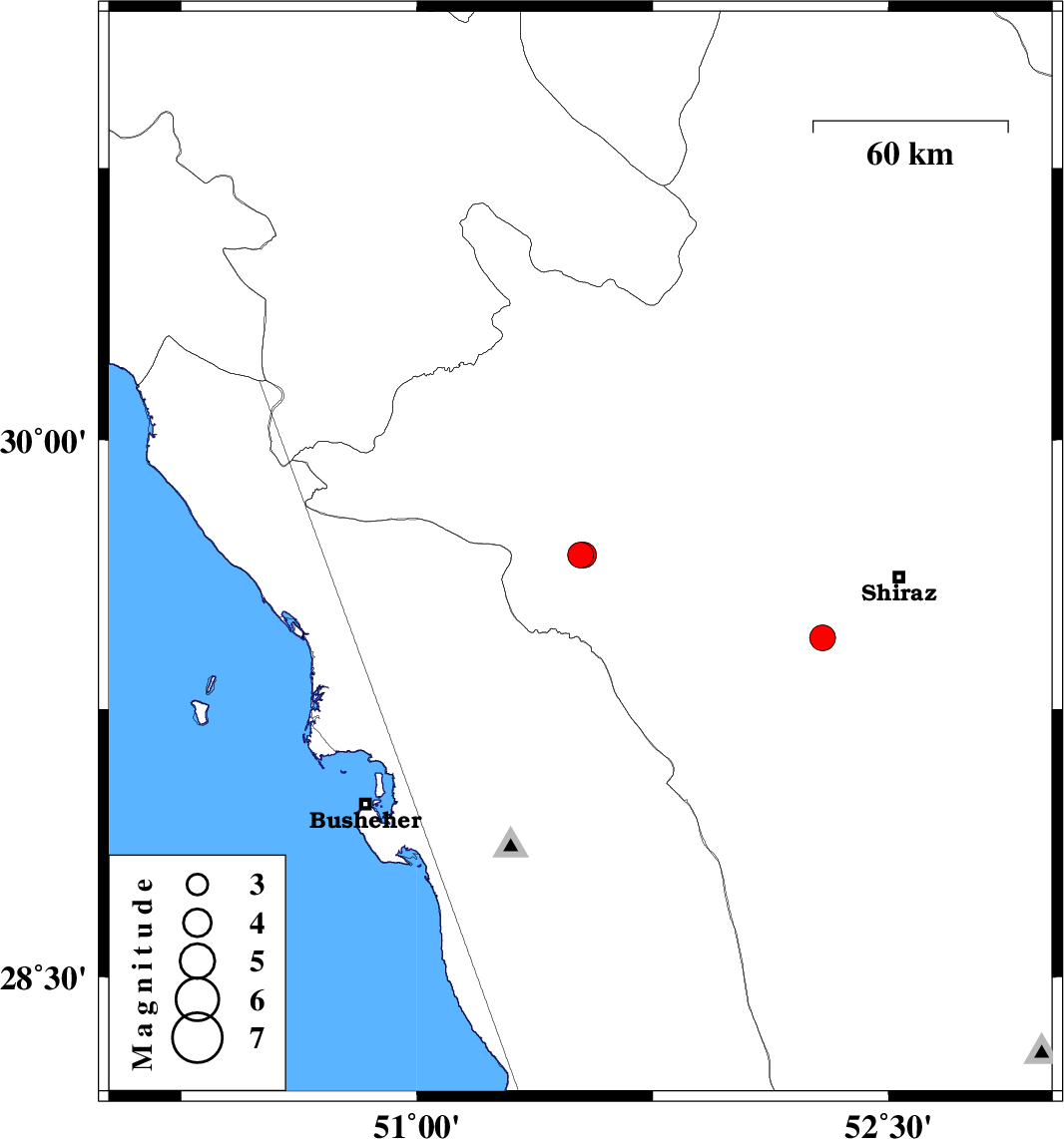 | 2007/06/27 | 00:08:50.3 | 03:38:50.3 | 29.68 | 51.52 | 14 | ML3.6 | 14 km West of Kazerun, Fars Province | ||