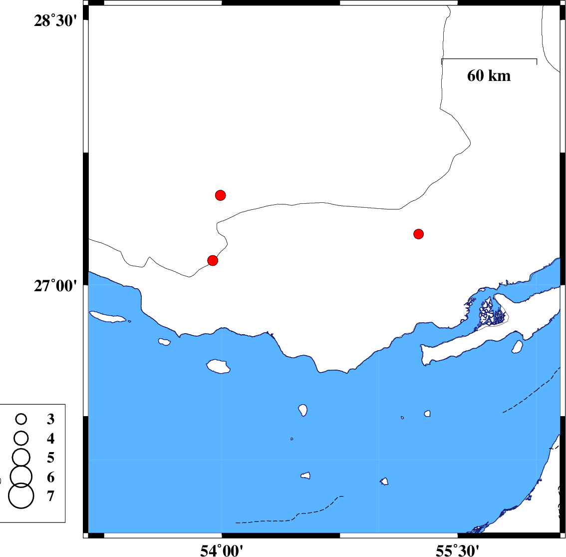 | 2007/05/20 | 23:43:26.4 | 03:13:26.4 | 27.45 | 54.7 | 16 | ML2.9 | 42 km North-East of Bastak, Hormozgan Province |