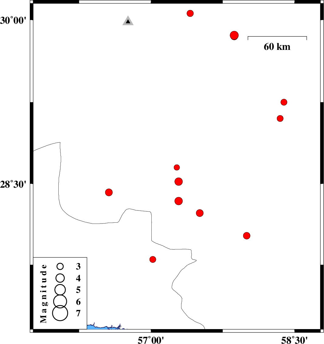 | 2007/06/22 | 22:07:33.4 | 01:37:33.4 | 27.8 | 57.02 | 14 | ML3 | 47 km North-West of Dehbarez, Hormozgan Province | ||