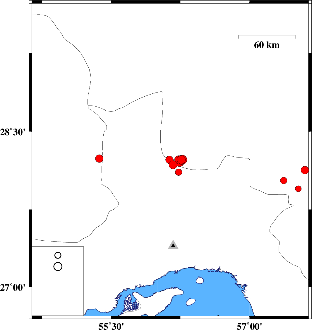 2007/04/21 15:34:32.6 19:04:32.6 27.9557.5315 ML3 15 km West of Kahnuj, Kerman Province