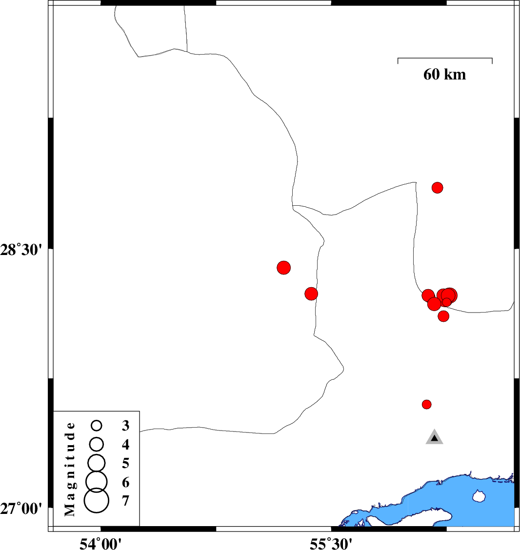 | 2007/04/18 | 15:45:27.8 | 19:15:27.8 | 27.6 | 56.12 | 15 | ML2.7 | 49 km North-West of Bandar-e abbas, Hormozgan Province |