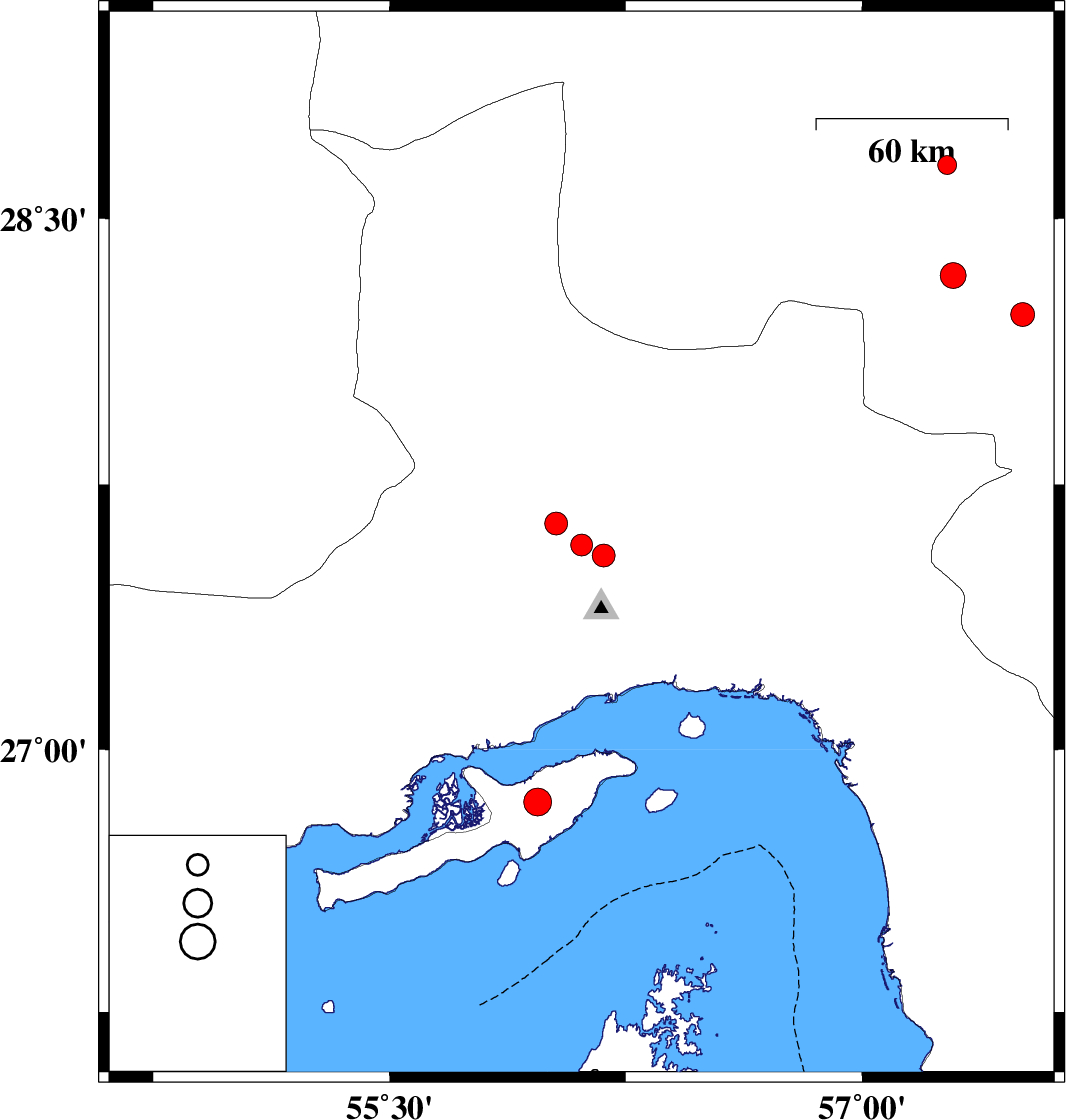 | 2007/06/27 | 19:08:16.9 | 22:38:16.9 | 26.85 | 55.97 | 17 | ML3.9 | Persian Gulf, 31 km South-West of Qeshm | ||