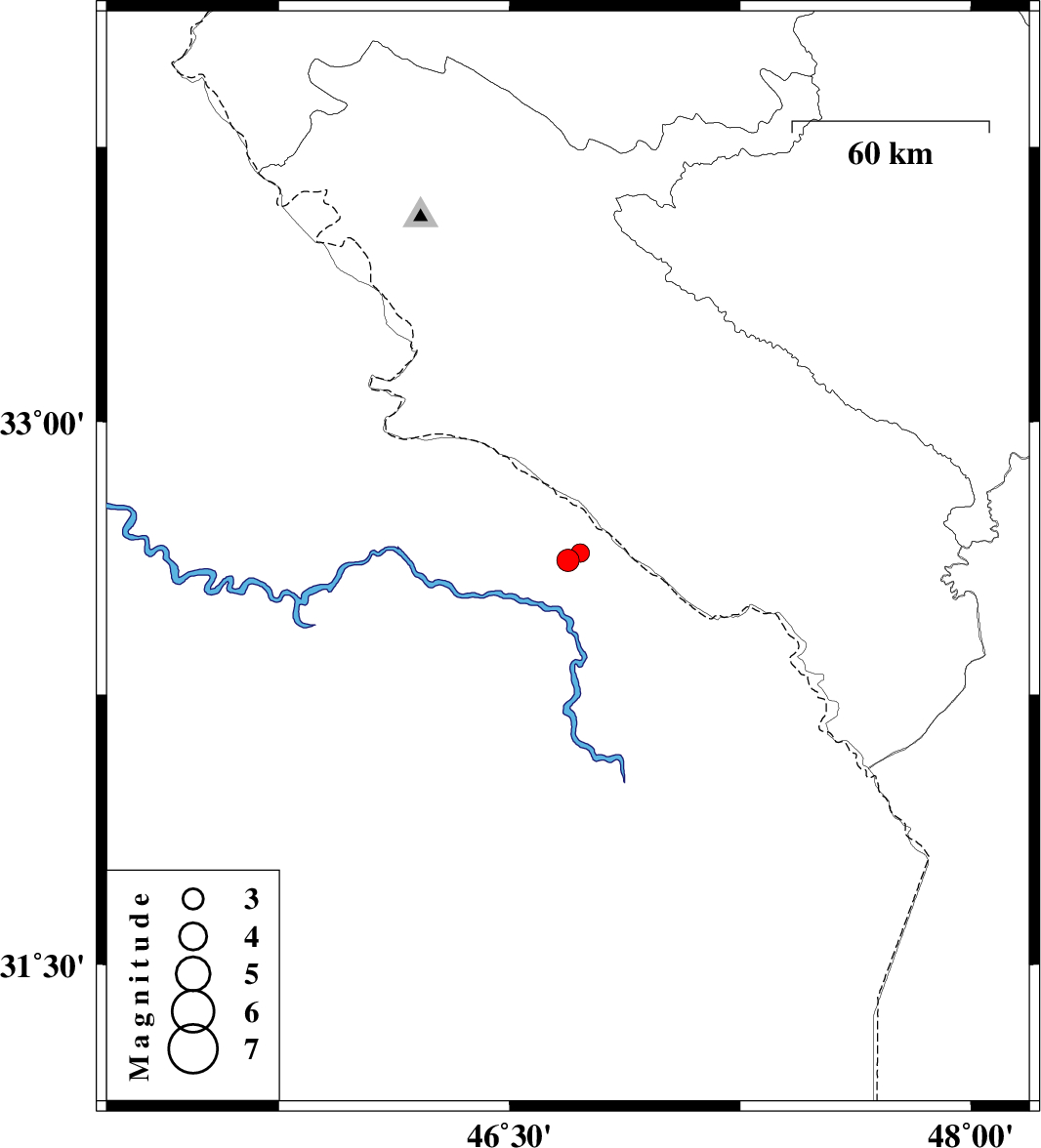 | 2007/07/03 | 08:29:02.2 | 11:59:02.2 | 32.64 | 46.73 | 18 | ML2.7 | 50 km West of Dehloran, Ilam Province |