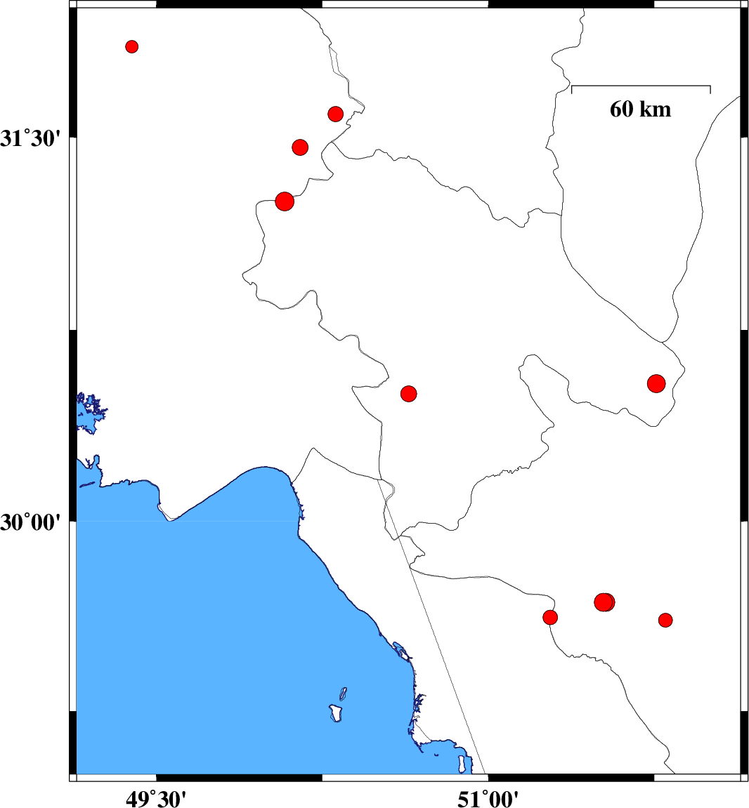 | 2007/06/27 | 00:08:50.3 | 03:38:50.3 | 29.68 | 51.52 | 14 | ML3.6 | 14 km West of Kazerun, Fars Province | ||