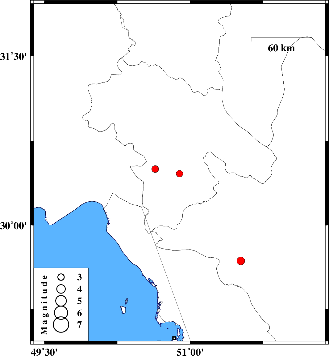 | 2007/06/27 | 00:08:50.3 | 03:38:50.3 | 29.68 | 51.52 | 14 | ML3.6 | 14 km West of Kazerun, Fars Province |