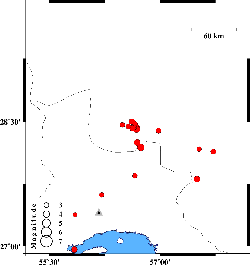 | 2007/08/13 | 16:11:13.2 | 19:41:13.2 | 27.85 | 56.66 | 14 | ML3.1 | 73 km North-West of Dehbarez, Hormozgan Province |