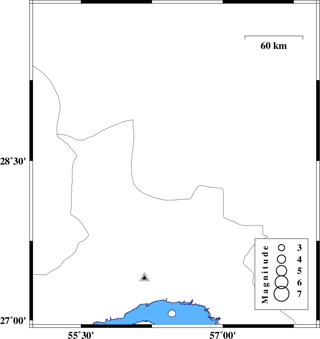 | 2007/08/13 | 16:11:13.2 | 19:41:13.2 | 27.85 | 56.66 | 14 | ML3.1 | 73 km North-West of Dehbarez, Hormozgan Province |