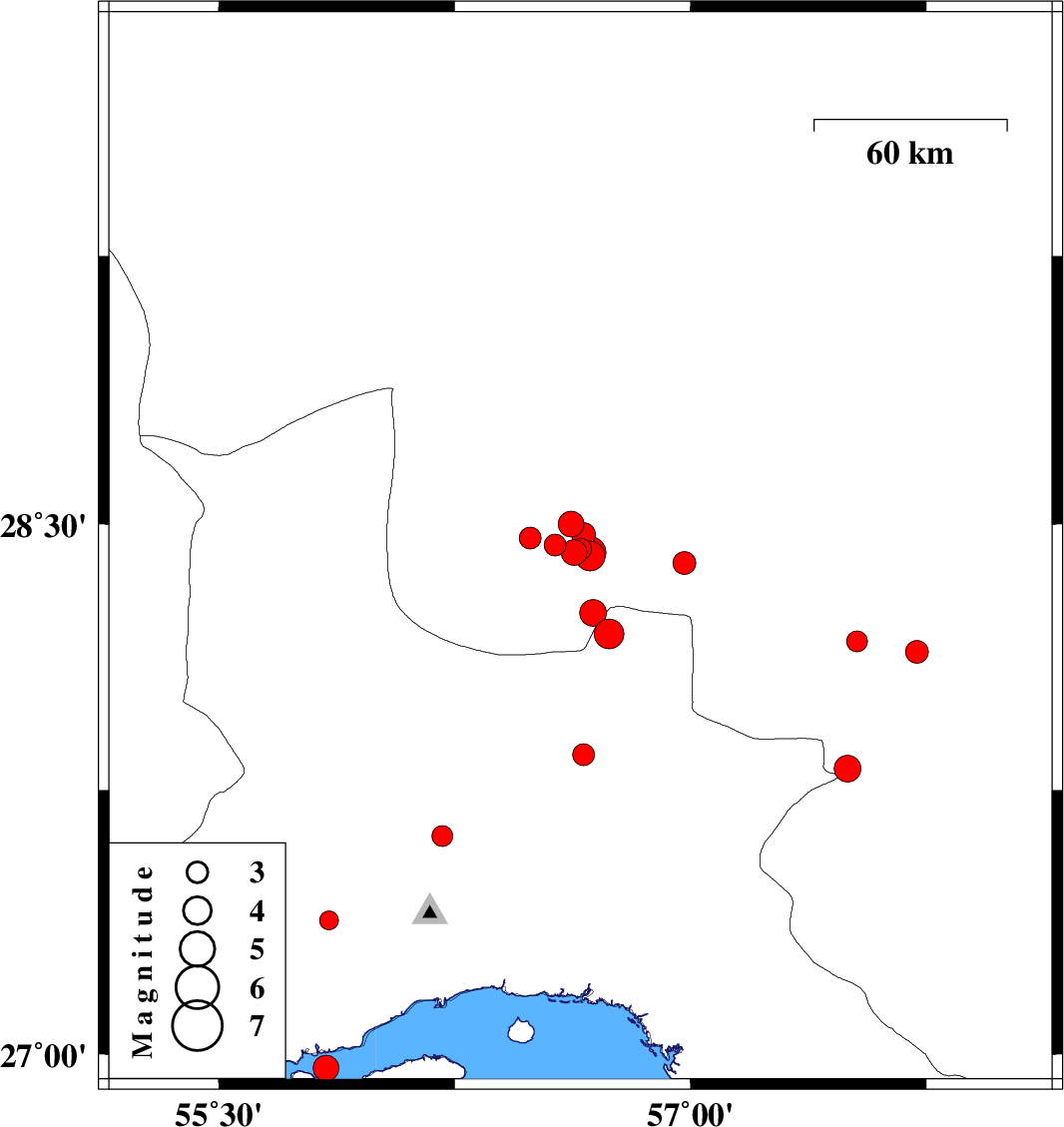 | 2007/08/13 | 16:11:13.2 | 19:41:13.2 | 27.85 | 56.66 | 14 | ML3.1 | 73 km North-West of Dehbarez, Hormozgan Province |