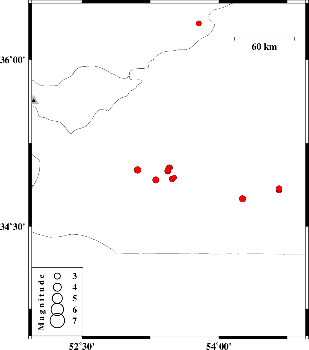 | 2007/08/16 | 23:41:09.7 | 03:11:09.7 | 34.83 | 54.66 | 18 | ML3.1 | 140 km South-East of Semnan, Semnan Province |