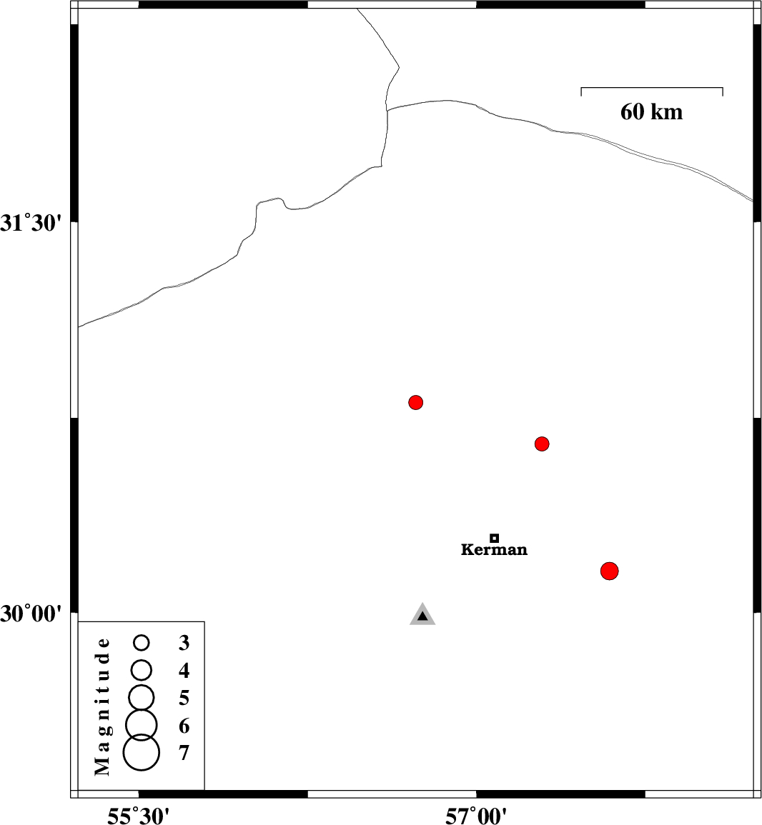 | 2007/08/16 | 12:41:25.1 | 16:11:25.1 | 30.16 | 57.59 | 15 | ML3.5 | 50 km South-East of Kerman, Kerman Province |