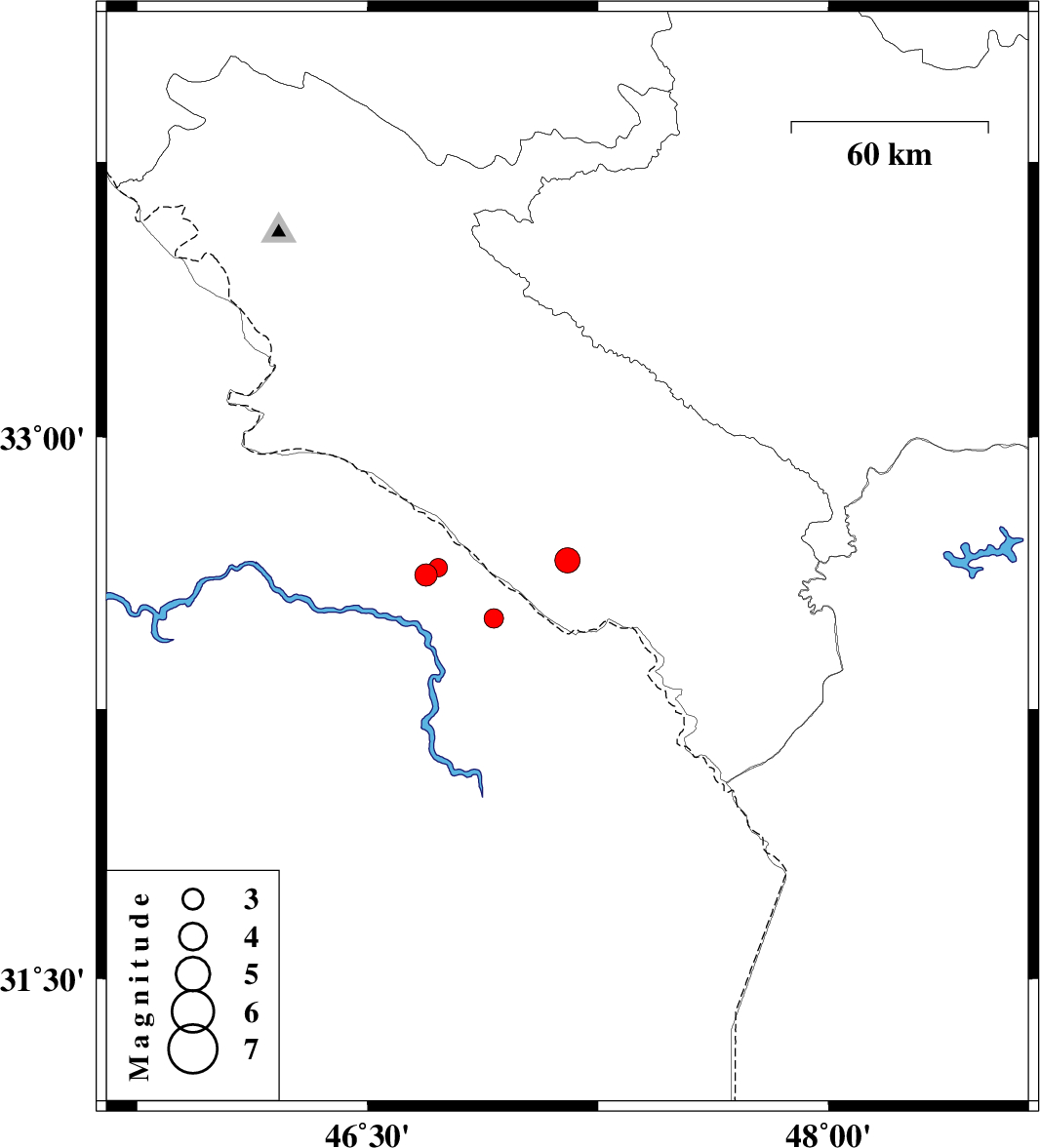 | 2007/07/03 | 08:29:02.2 | 11:59:02.2 | 32.64 | 46.73 | 18 | ML2.7 | 50 km West of Dehloran, Ilam Province |