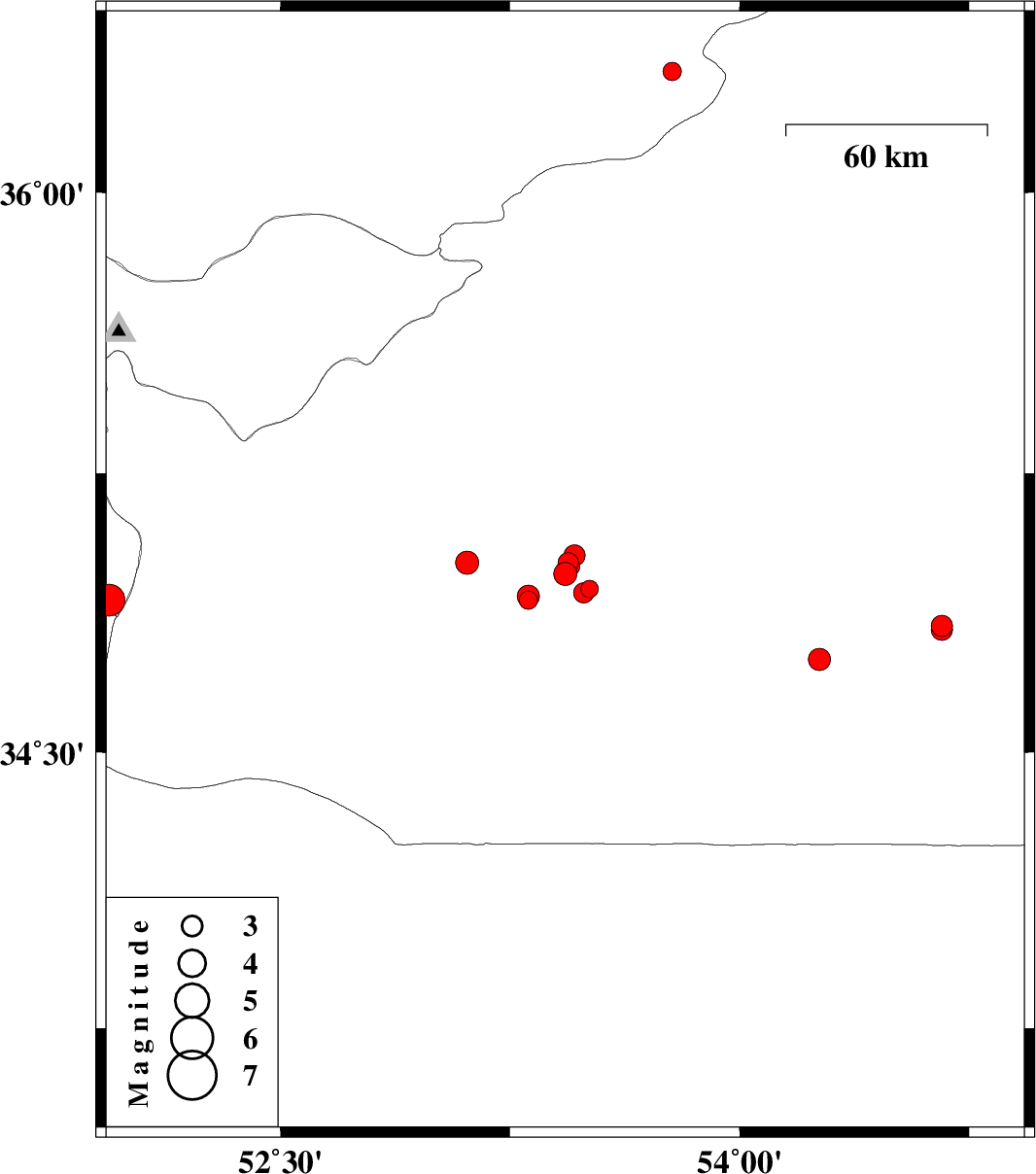 | 2007/09/04 | 16:15:36.6 | 19:45:36.6 | 35 | 53.44 | 14 | ML3.1 | 63 km South of Semnan, Semnan Province | ||