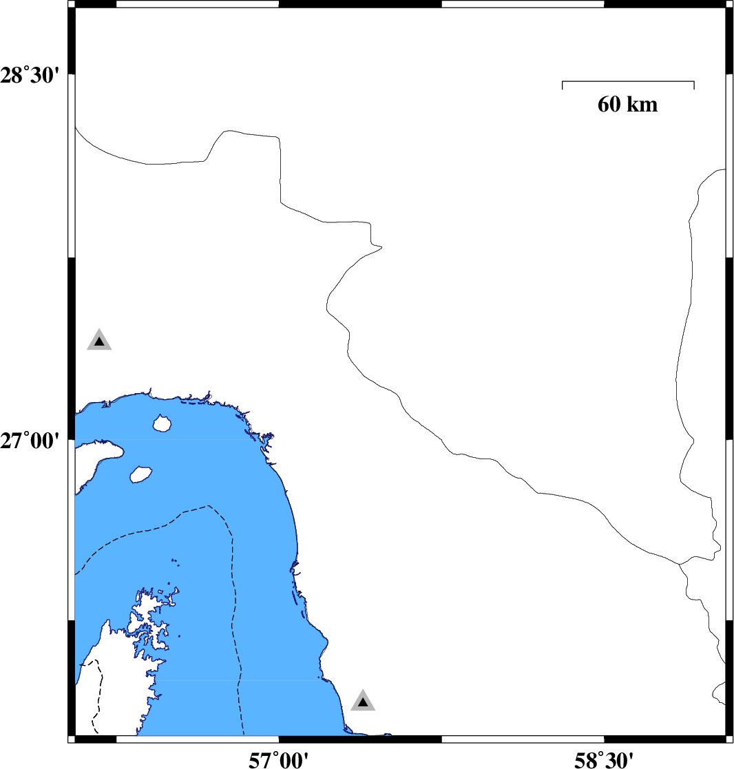 | 2007/07/09 | 01:11:11.3 | 04:41:11.3 | 27.85 | 56.92 | 38 | ML3.6 | 56 km North-West of Dehbarez, Hormozgan Province |