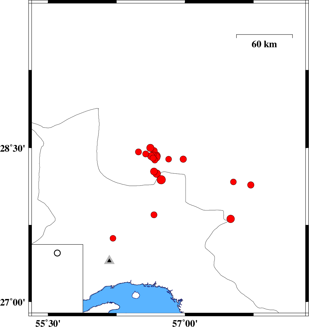 | 2007/08/29 | 19:34:01.1 | 23:04:01.1 | 28.5 | 56.62 | 18 | ML3.6 | 73 km North-East of Hajiabad, Hormozgan Province | ||