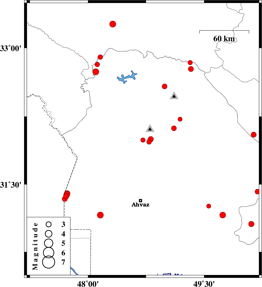 | 2007/08/31 | 02:12:46.3 | 05:42:46.3 | 31.38 | 47.72 | 14 | ML3.2 | 48 km South-West of Susangerd, Khoozestan Province | ||