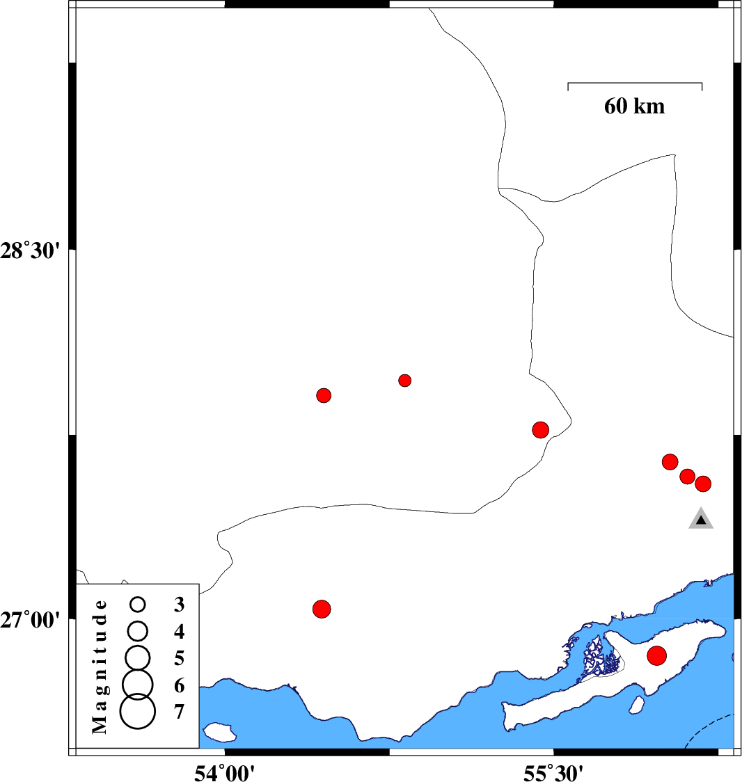 | 2007/06/27 | 19:08:16.9 | 22:38:16.9 | 26.85 | 55.97 | 17 | ML3.9 | Persian Gulf, 31 km South-West of Qeshm | ||