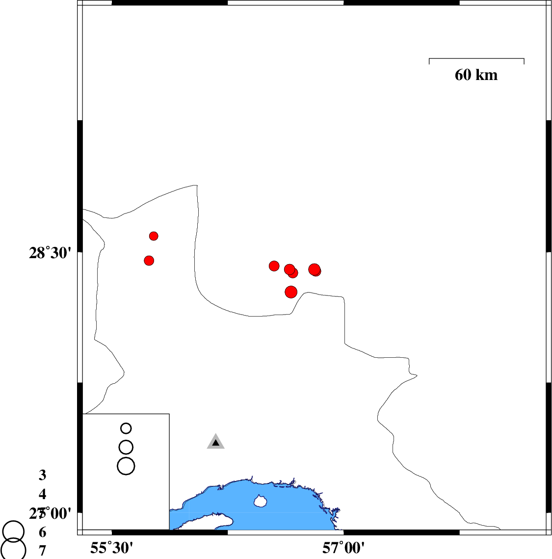 | 2007/09/10 | 10:36:02.5 | 14:06:02.5 | 28.39 | 56.82 | 15 | ML3 | 90 km East of Hajiabad, Hormozgan Province | ||