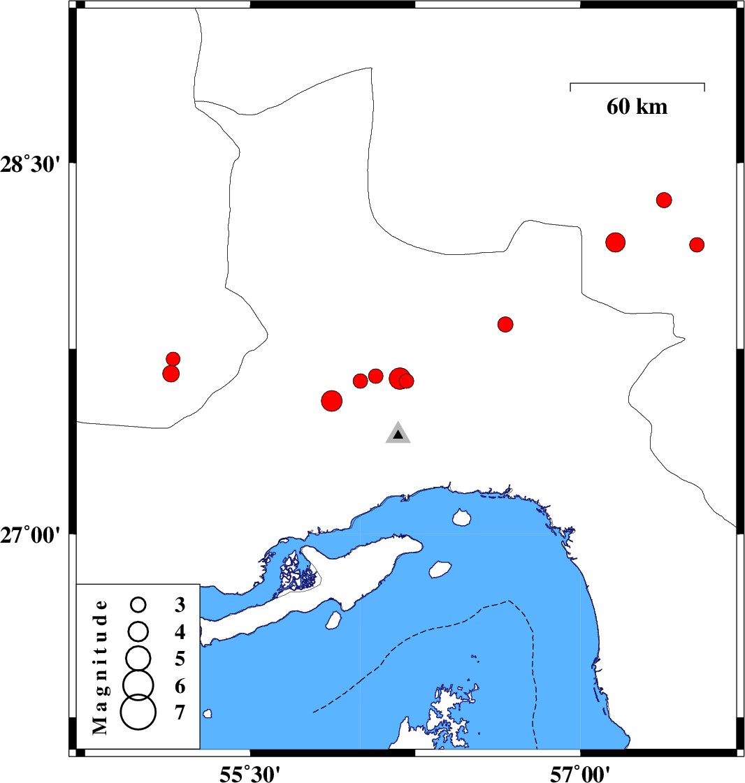 | 2007/07/23 | 19:19:00.8 | 22:49:00.8 | 27.62 | 56 | 14 | ML2.9 | 55 km North-West of Bandar-e abbas, Hormozgan Province | ||