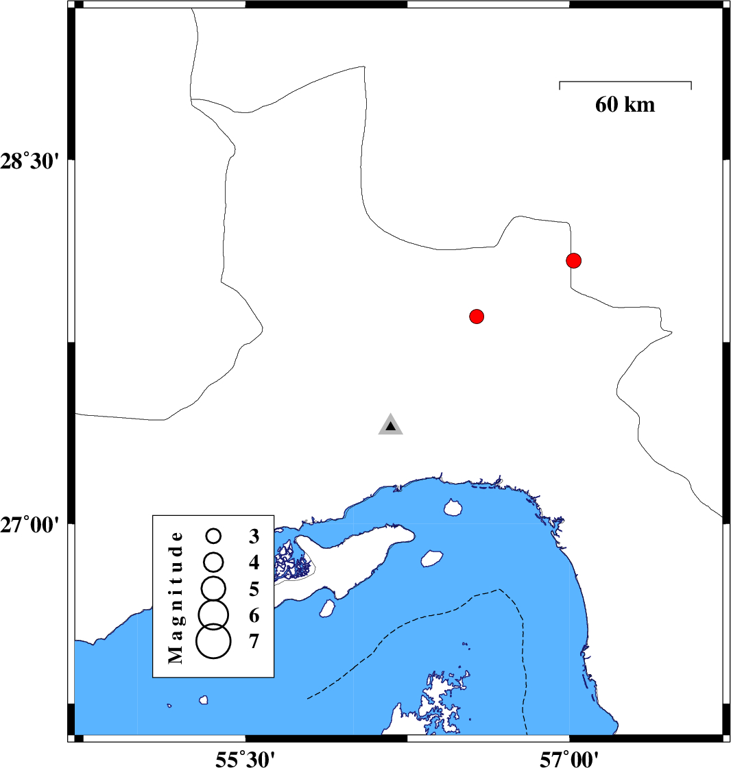 | 2007/08/13 | 16:11:13.2 | 19:41:13.2 | 27.85 | 56.66 | 14 | ML3.1 | 73 km North-West of Dehbarez, Hormozgan Province |