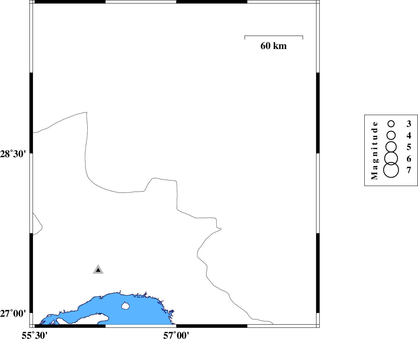 | 2007/07/23 | 19:19:00.8 | 22:49:00.8 | 27.62 | 56 | 14 | ML2.9 | 55 km North-West of Bandar-e abbas, Hormozgan Province | ||