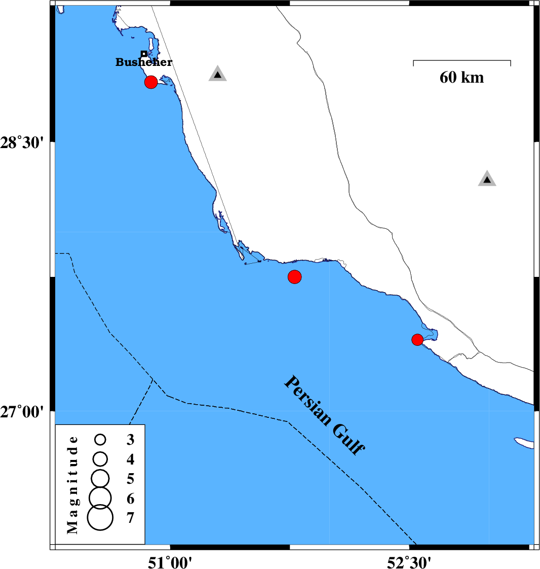 | 2007/08/01 | 23:15:21.0 | 02:45:21.0 | 28.83 | 50.88 | 43 | ML3.7 | Persian Gulf, 17 km South of Busheher | ||
