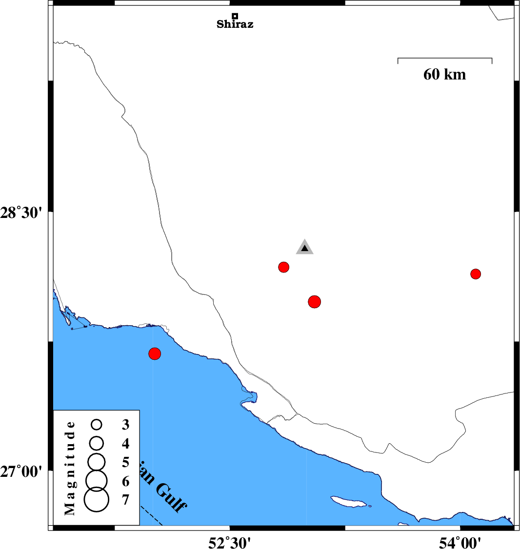 | 2007/09/05 | 14:13:08.2 | 17:43:08.2 | 27.68 | 52.01 | 25 | ML3.5 | Persian Gulf, 17 km South of Bandar-e kangan | ||