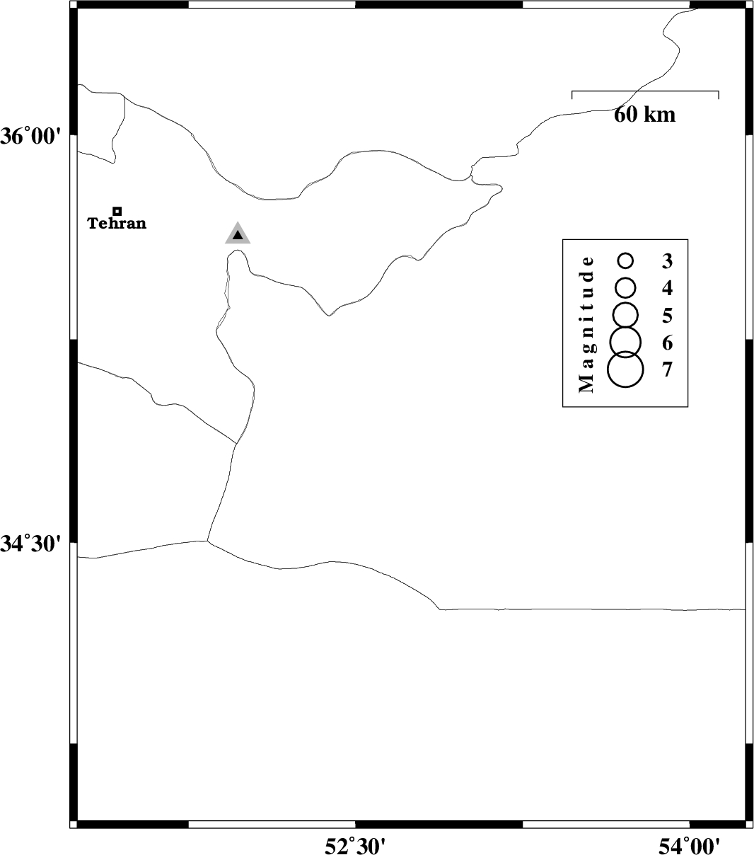 | 2007/09/19 | 06:02:33.1 | 09:32:33.1 | 34.99 | 52.68 | 15 | ML2.5 | 40 km South-East of Garmsar, Semnan Province | ||