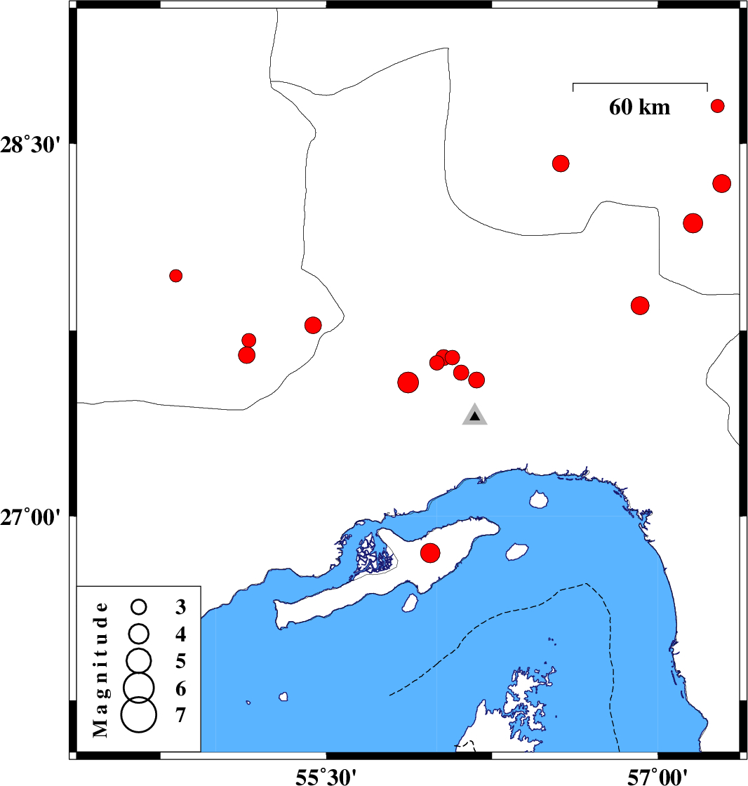 | 2007/06/27 | 19:08:16.9 | 22:38:16.9 | 26.85 | 55.97 | 17 | ML3.9 | Persian Gulf, 31 km South-West of Qeshm | ||