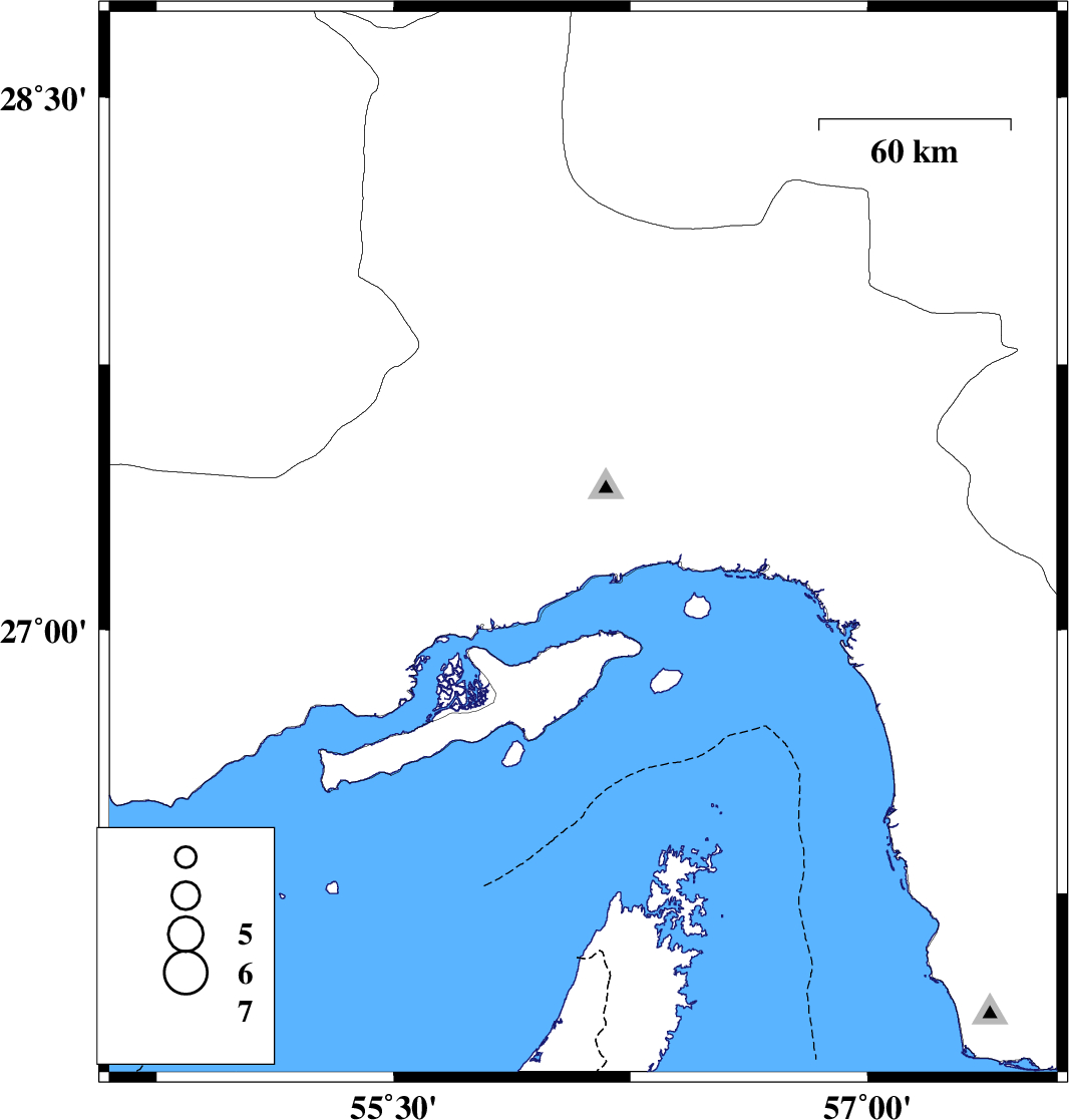 | 2007/09/23 | 21:06:07.6 | 00:36:07.6 | 27.24 | 56.1 | 41 | ML3.2 | 18 km West of Bandar-e abbas, Hormozgan Province |