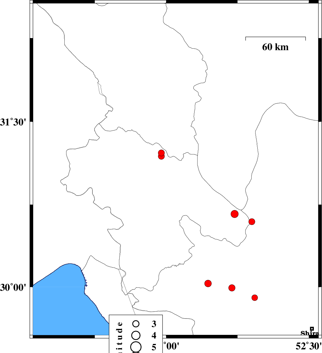 | 2007/06/26 | 21:17:37.3 | 00:47:37.3 | 29.68 | 51.53 | 14 | ML3.7 | 13 km West of Kazerun, Fars Province |