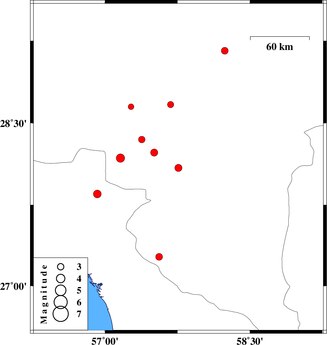 | 2007/07/09 | 01:11:11.3 | 04:41:11.3 | 27.85 | 56.92 | 38 | ML3.6 | 56 km North-West of Dehbarez, Hormozgan Province | ||