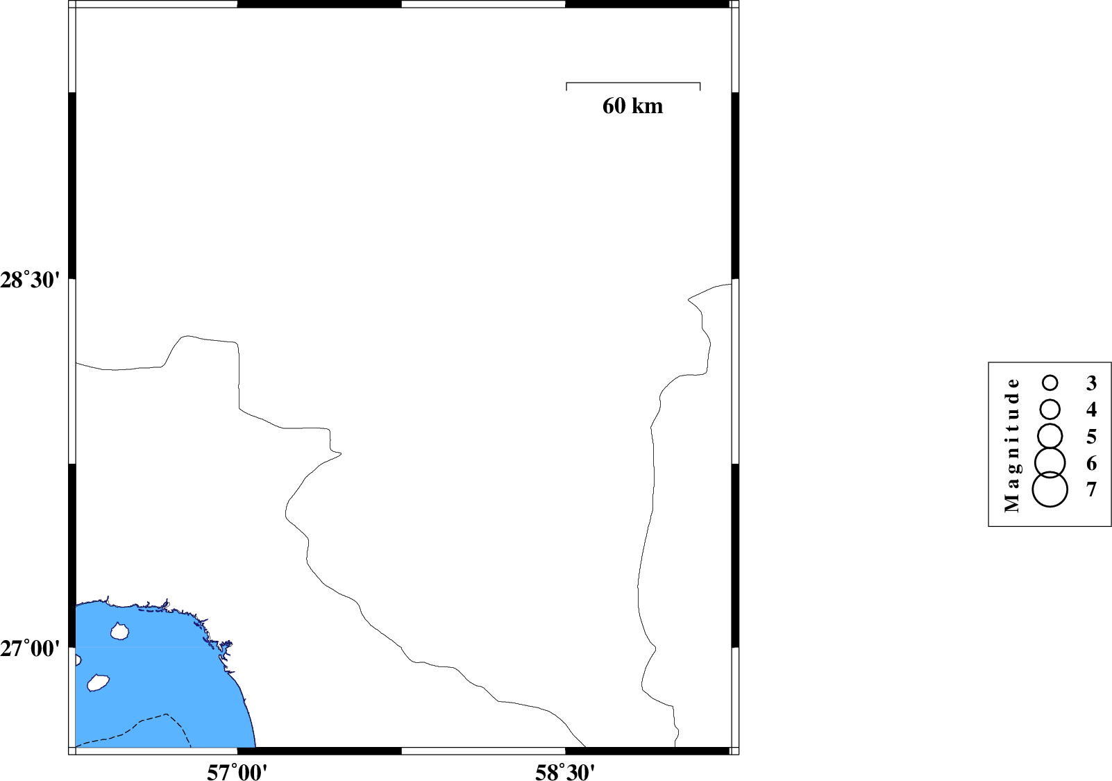| 2007/07/26 | 11:40:11.1 | 15:10:11.1 | 28.09 | 57.76 | 14 | ML3.4 | 17 km North of Kahnuj, Kerman Province | ||