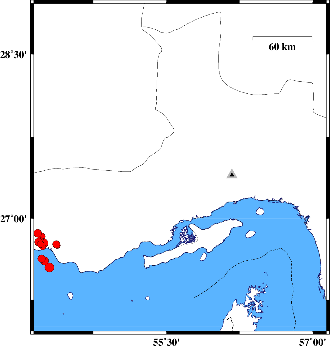 | 2007/09/18 | 04:38:54.2 | 08:08:54.2 | 26.89 | 54.36 | 35 | ML2.9 | 34 km South of Bastak, Hormozgan Province | ||