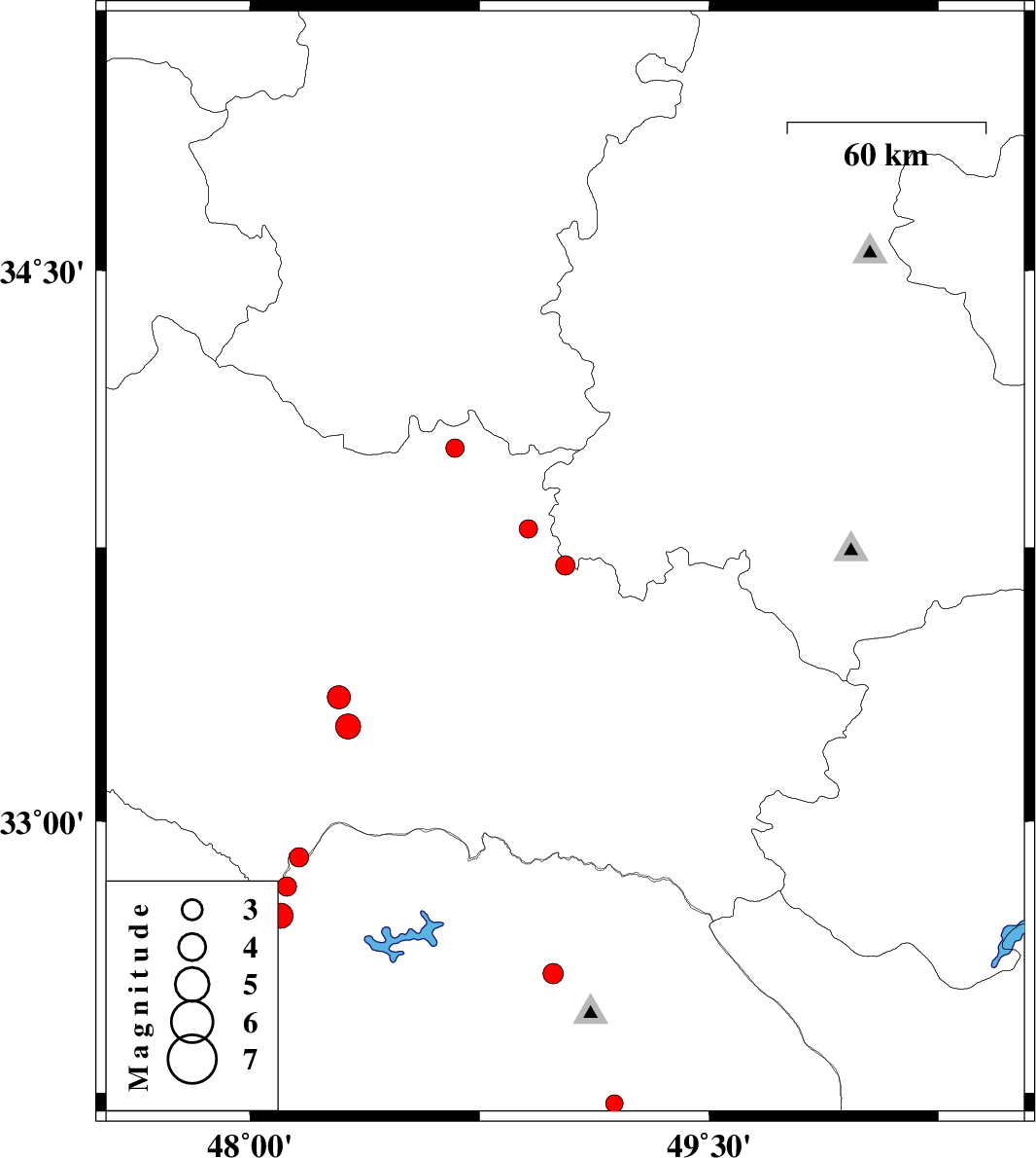 | 2007/08/14 | 17:39:55.2 | 21:09:55.2 | 33.26 | 48.32 | 39 | ML3.6 | 25 km South of Khorramabad, Lorestan Province | ||