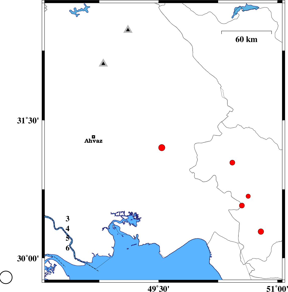 | 2007/08/27 | 04:16:57.5 | 07:46:57.5 | 31.26 | 49.56 | 45 | ML2.6 | 5 km Ramhormoz, Khoozestan Province | ||