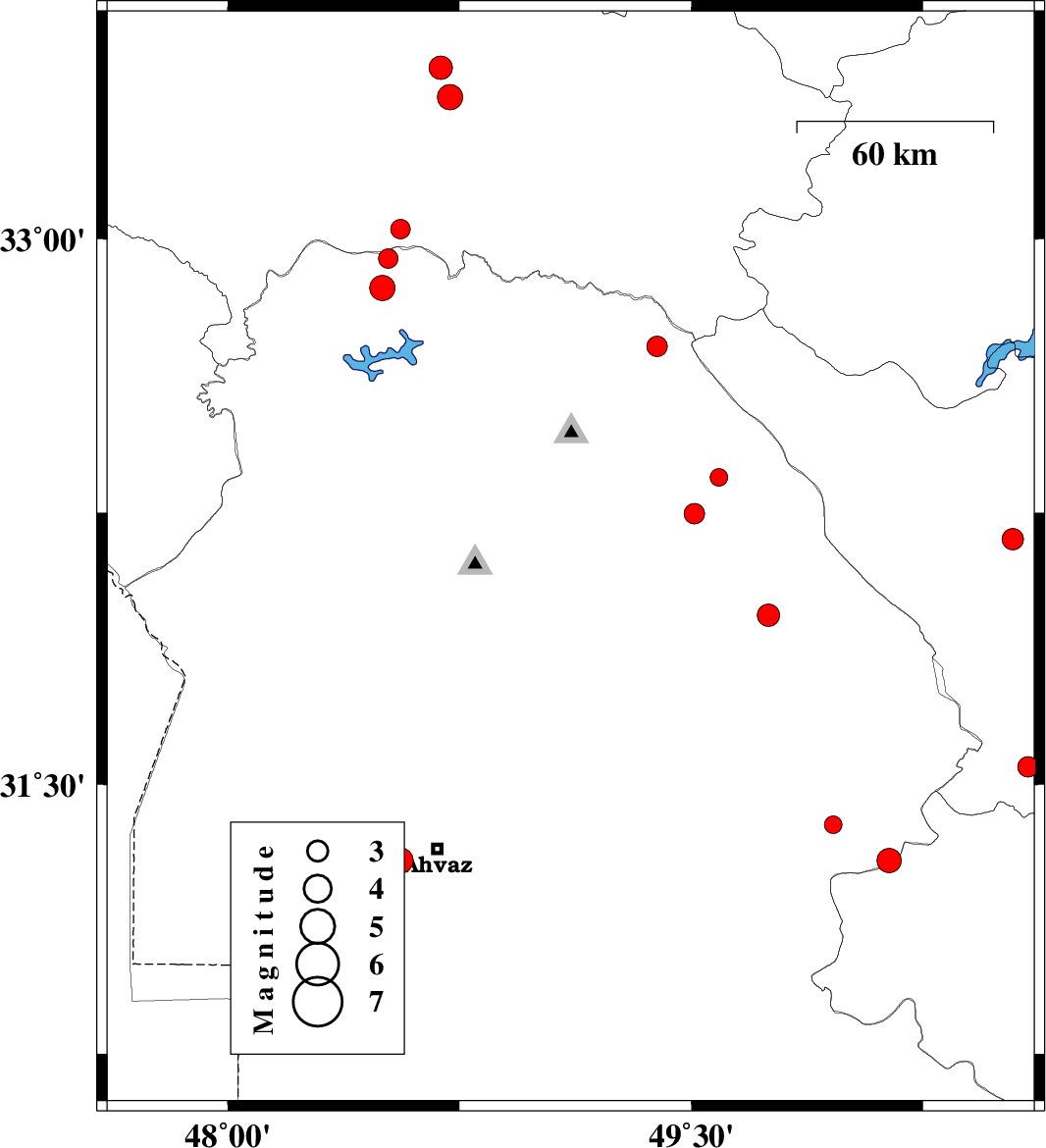| 2007/08/14 | 17:39:55.2 | 21:09:55.2 | 33.26 | 48.32 | 39 | ML3.6 | 25 km South of Khorramabad, Lorestan Province | ||