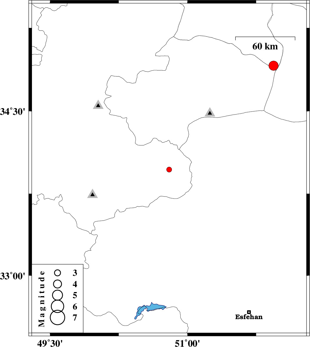 | 2007/08/28 | 08:08:10.6 | 11:38:10.6 | 33.97 | 50.8 | 16 | ML2.6 | 11 km East of Delijan, Markazi Province | ||