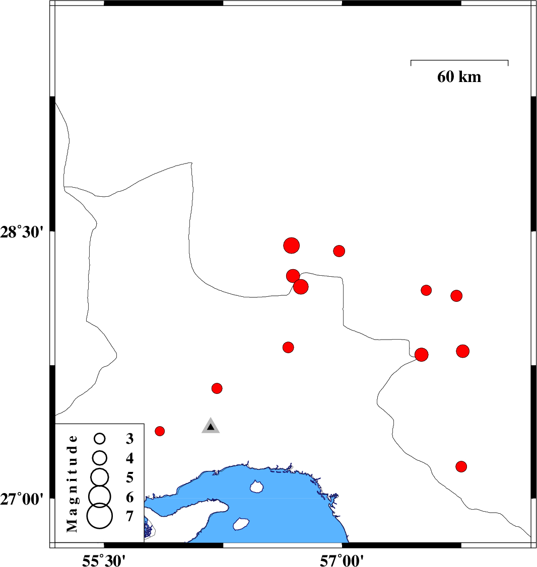 | 2007/07/31 | 11:04:19.6 | 14:34:19.6 | 27.83 | 57.76 | 14 | ML3.6 | 14 km South of Kahnuj, Kerman Province |