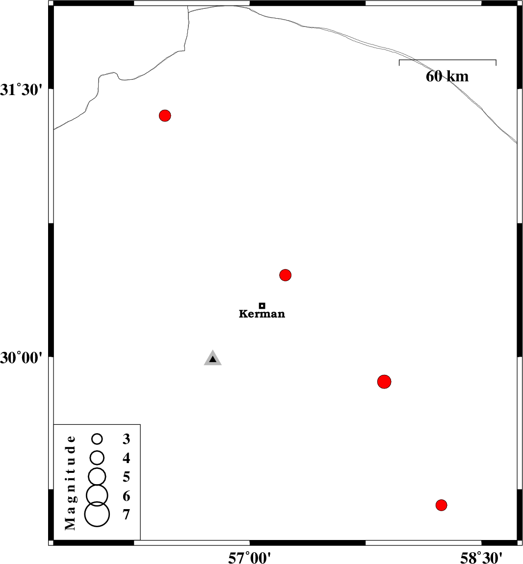 | 2007/06/28 | 13:05:37.3 | 16:35:37.3 | 29.86 | 57.87 | 14 | ML3.9 | 89 km South-East of Kerman, Kerman Province |