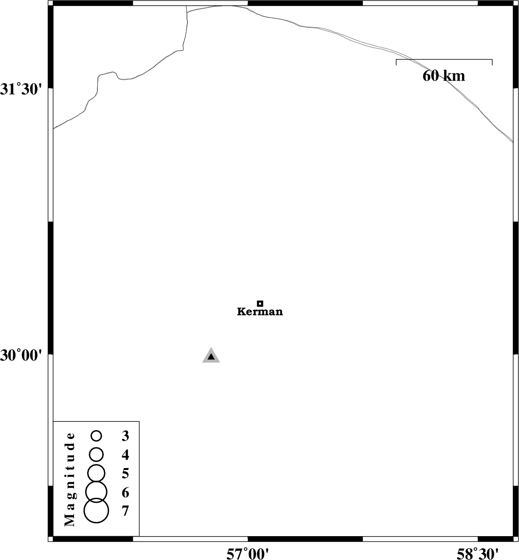 | 2007/07/28 | 21:43:07.4 | 01:13:07.4 | 30.46 | 57.23 | 17 | ML3.4 | 23 km North-East of Kerman, Kerman Province |